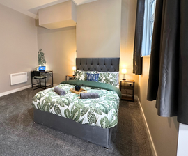 Hanley Suite is a stylish, open-plan apartment in Hanley, Stoke on Trent perfect for couples or workers. It features a cosy king-size bed, a smart TV, and standard Wi-Fi. The living area flows into a fully equipped kitchen with an oven, cooking essentials, and a washing machine for convenience.